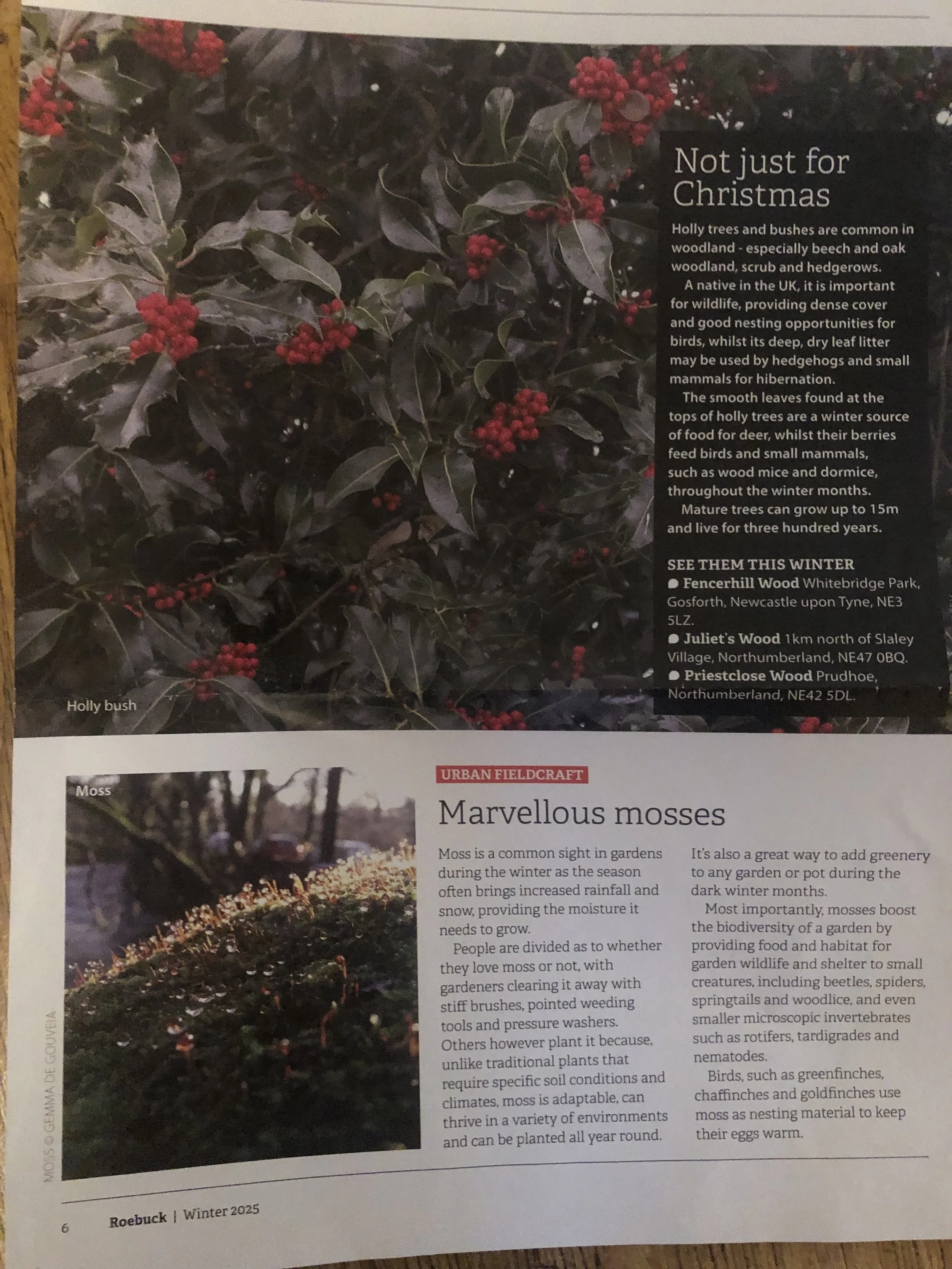 Clare read the most recent RSPB and Roebuck (Northumberland Wildfife Trust) magazines. She especially enjoyed the articles on Holly and mosses in Roebuck.