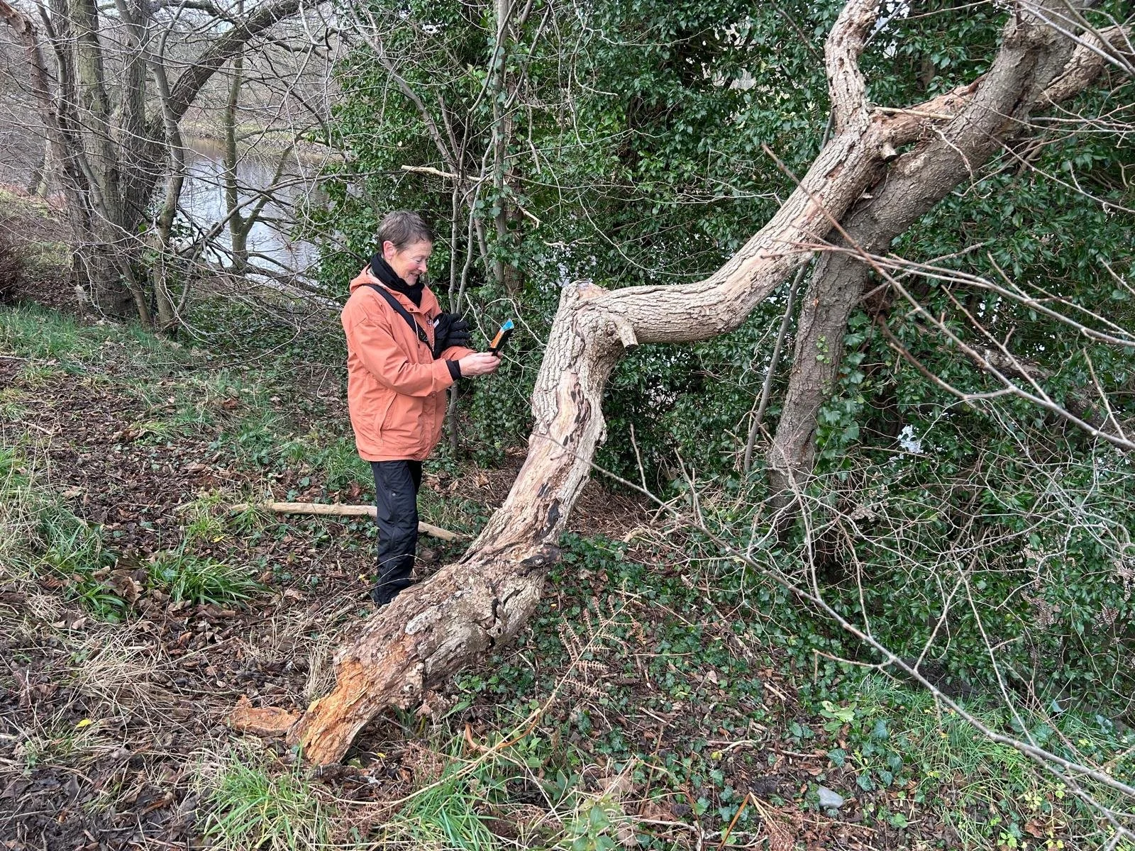 Below is the daddock Clare spotted, the black fungus growing on it - King Alfred’s Cakes Daldinia concentrica, which are round, black and hard; they are named for their resemblance to burnt cakes, they make excellent firelighters - and Jane’s photo of Clare capturing the fungus on camera. Clare finds it pleasing that both the fungus and its rotten wood host are good for fire-lighting.
