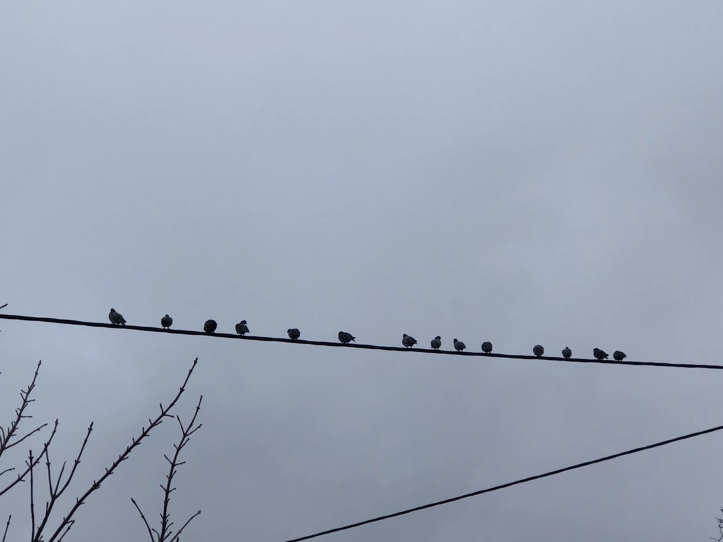 Clare identified 21 different bird species on her walk today: Buzzard, Kestrel, Pheasant, Carrion Crow, Rook, Magpie, Jay, Blackbird, Robin, Dunnock, House Sparrow, Wren, Coal Tit, Blue Tit, Great Tit, Fieldfare, Redwing, Common Gull, Black-headed Gull, Wood Pigeon and a single Goldcrest. One hedge was quite noisy with House Sparrows. The Pigeons on a wire nearby look quite organised in comparison.