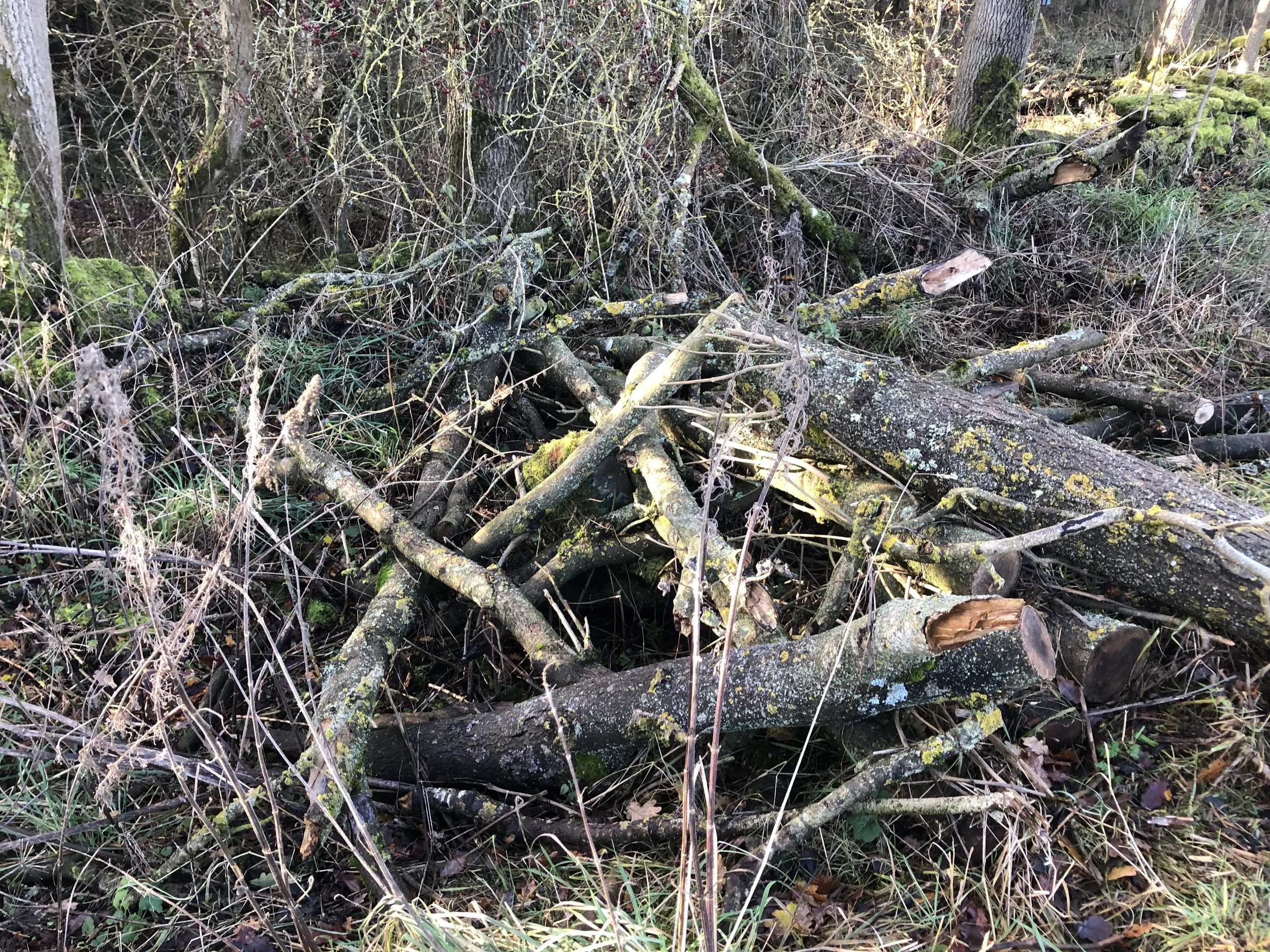 Rewards for Ash clearing today included a patch of Yellow Brain fungus, some more and more Barnacly fungus, a 7 spot ladybird and a satisfying stack of logs.