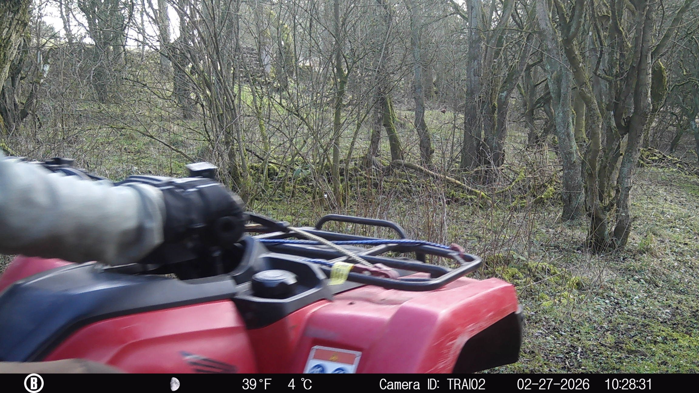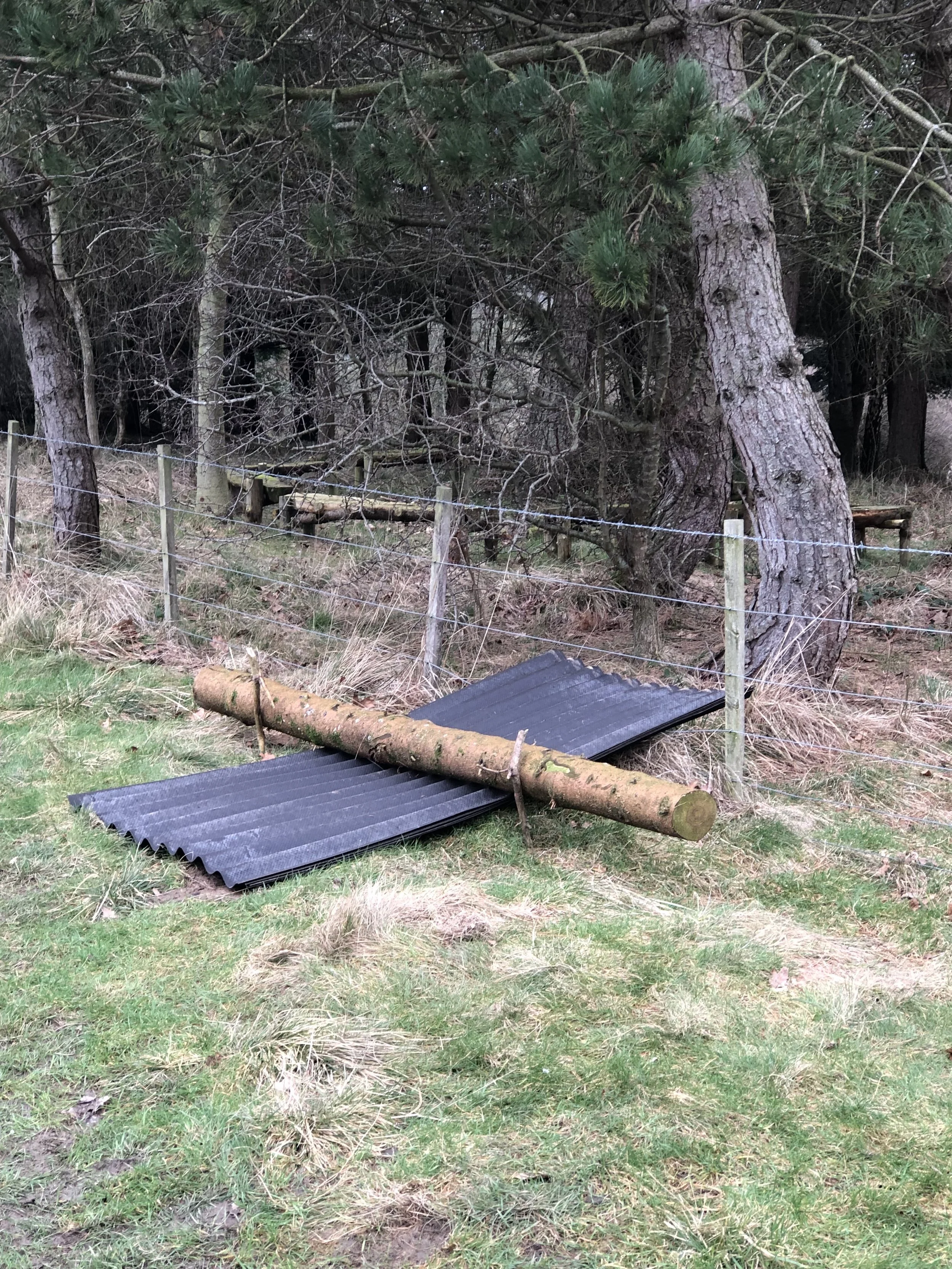 Clare’s son Hal joined John to move logs from the Orchard to the log shed. They worked so hard there was no time for a photograph. The trail camera, however did provide some evidence of all the activity. Hal also moved the roof sheets nearer to the hide ready for the repair work.