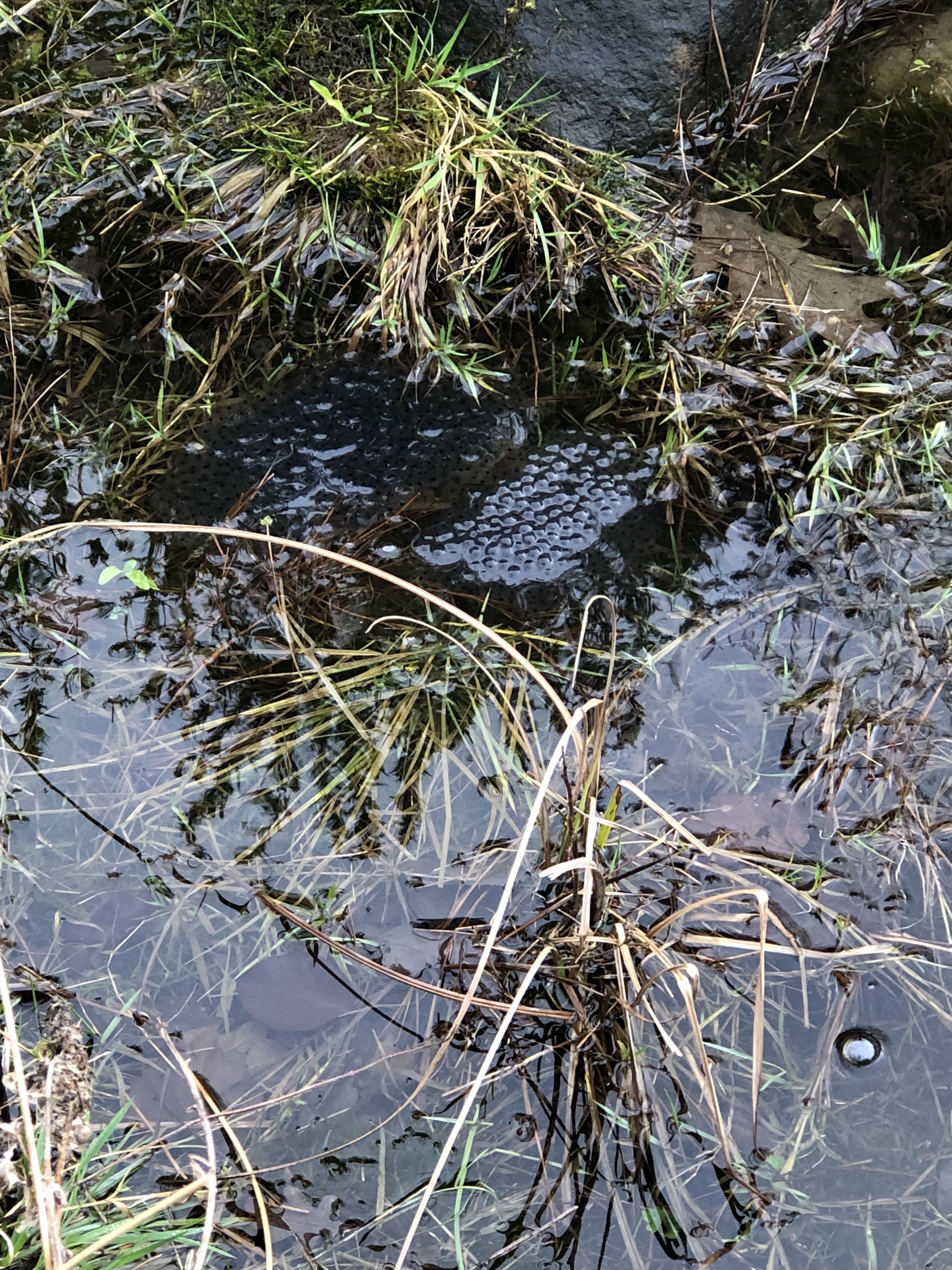 Clare decided she had had quite enough inactivity and accompanied John on a quick change discs/fill feeders visit to Liddells. She checked on the Aconites - plenty of foliage though no buds in view. As she approached the Roadside Pond she spotted activity in the water and sure enough, there was a fresh deposit of frogspawn and a frog beating a retreat. The next delight was Redpolls on the feeders; at least two males and two females. The warmer weather is prompting Spring activity.