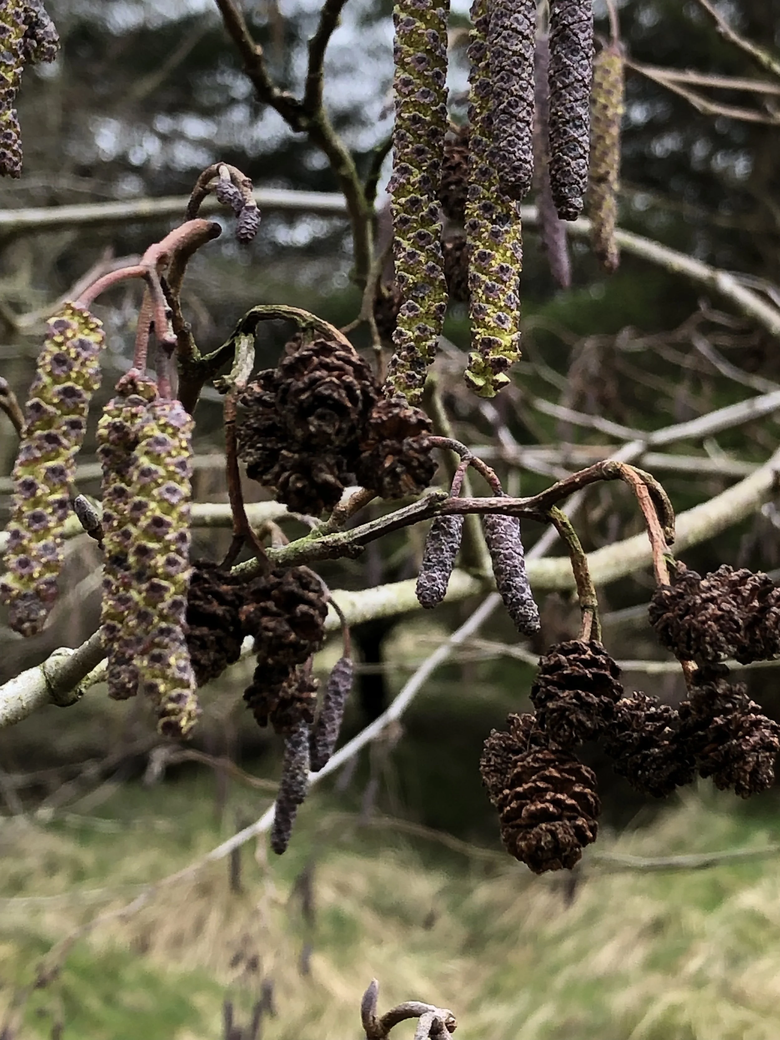 John took the lovely photograph of Alder catkins below. Alder is monoecious - male (long/yellow) and female (short/woody) catkins are found on the same tree.
