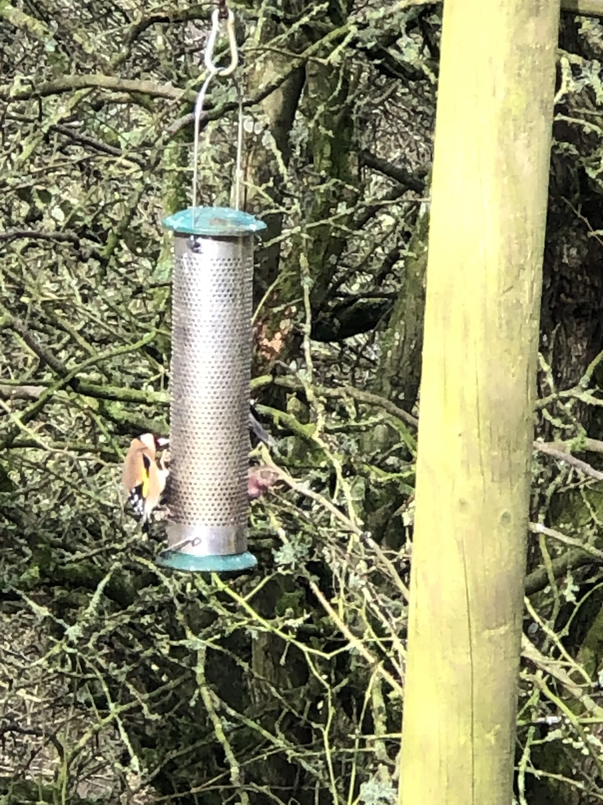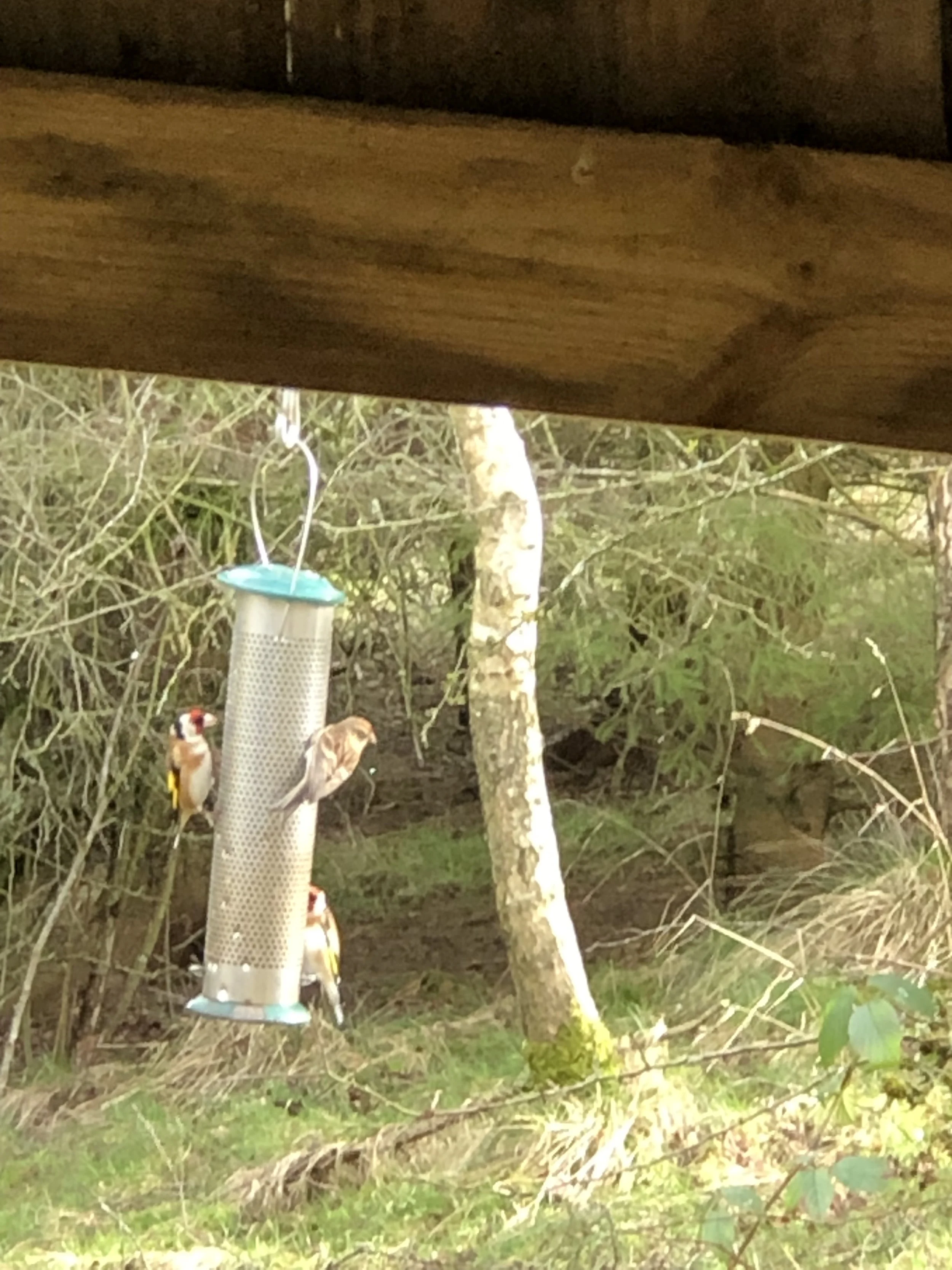 John, with his two good hands, fared slightly better with his shot of the female sharing this feeder with two Goldfinches. John will add ‘camera’ to his list of things to take up to Liddells.