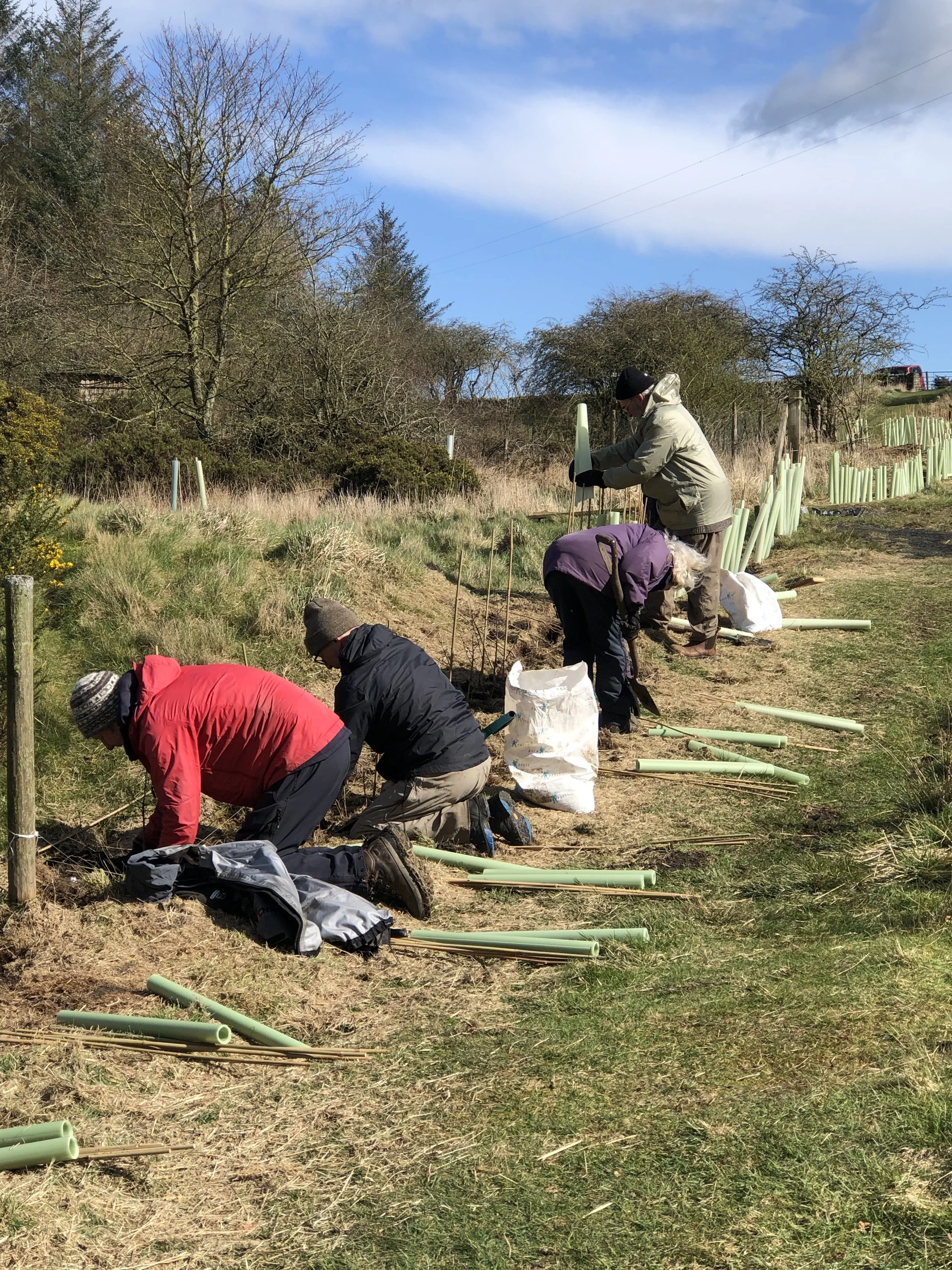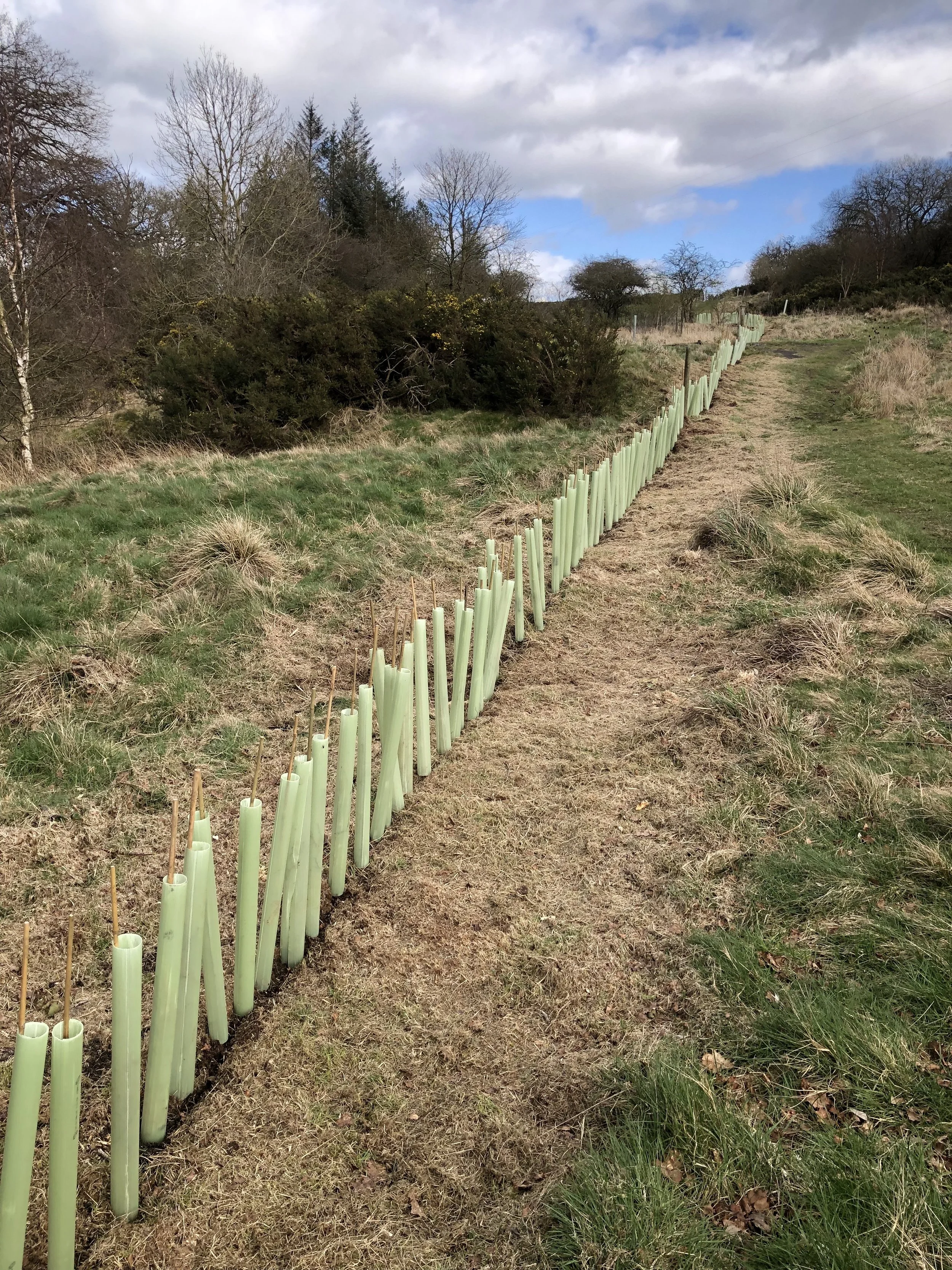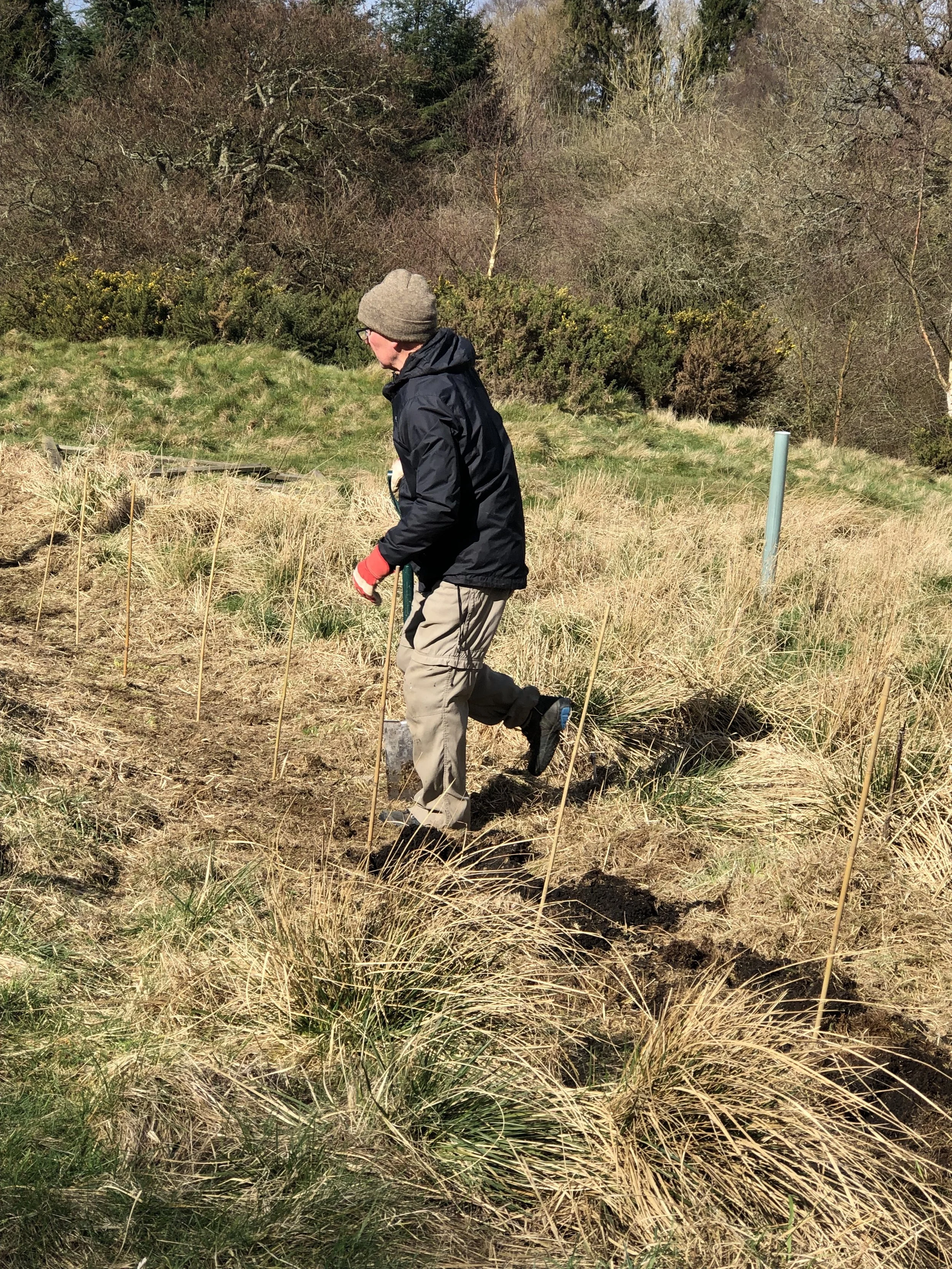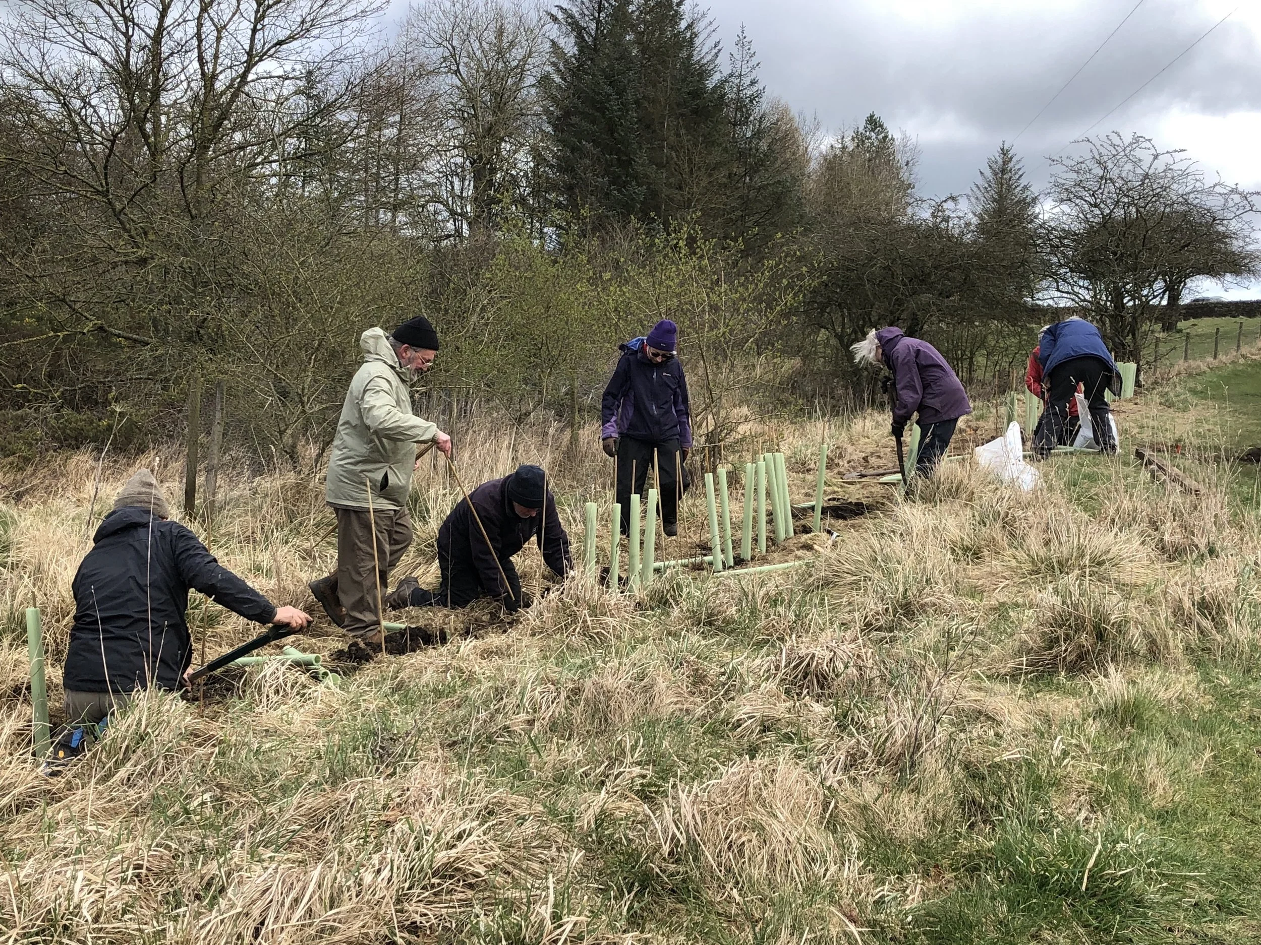 A good forecast came as a relief. Seven noble friends and helpers arrived with spades, energy and goodwill and the planting began. By lunchtime, assisted by a shortbread break, over half the planting was complete. John wondered whether to defer the rest till the next day, however the general consensus was to press on. Lunch and more baked goods were restorative and by 2.17 all the work was done. It was fortunate that the work finished before the appointed time of 3pm. At 2.55 an almighty hail storm erupted. The planting was a terrific achievement and Clare and John are hugely appreciative of all the friends who gave up their time to help. People seem to enjoy getting tired, sometimes wet, muddy, scratched, stung more besides and come back for more, thanking John and Clare for the opportunity. It is a source of touching wonder to John and Clare. Long may it continue.