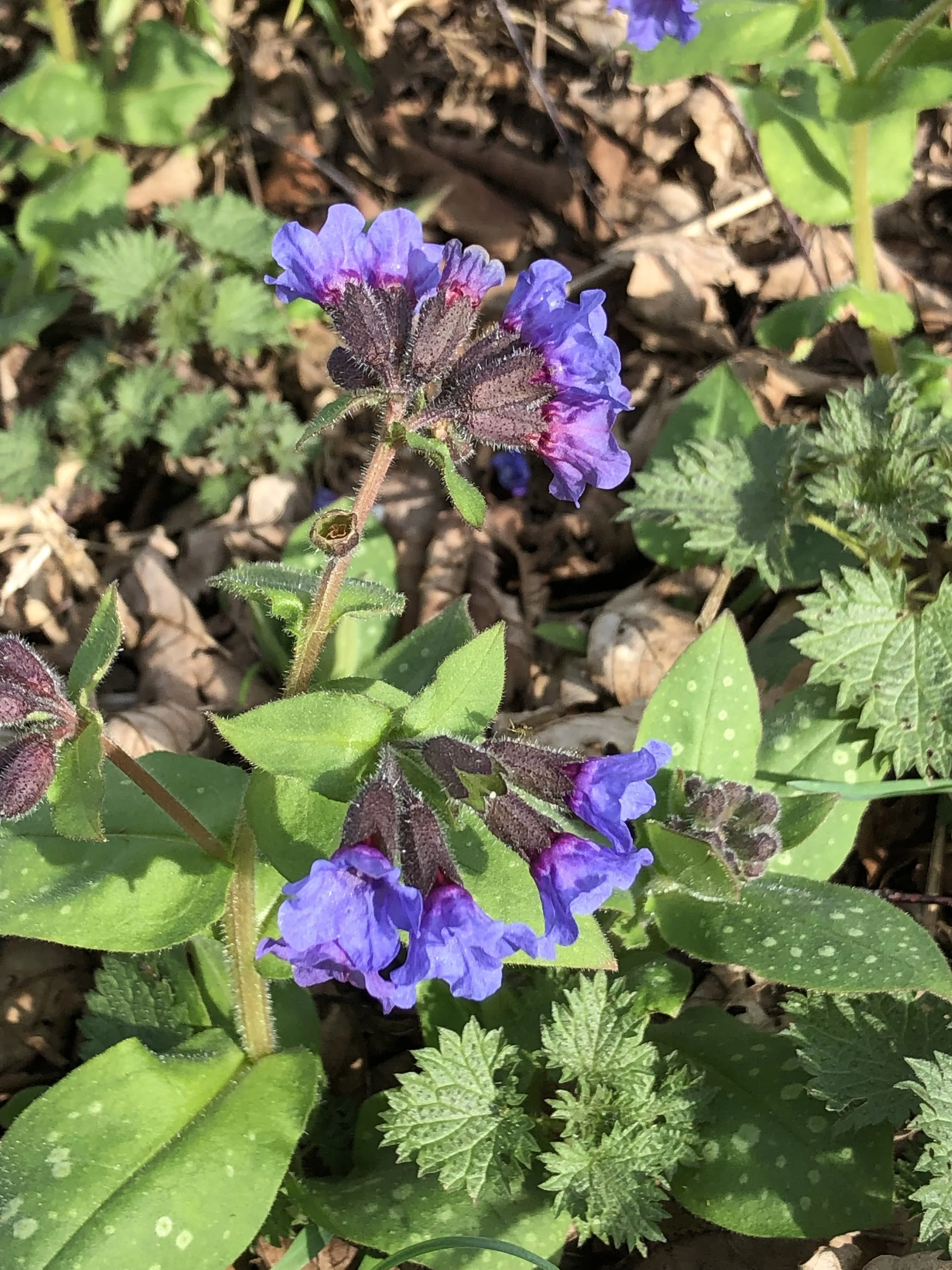 Furthering her involvement in the significance of the day, Clare spotted Opposite-leaved Golden Saxifrage in flower in the Pit Wood. She walked through the Top Strip to see how the Daffodils are spreading and found Wild Garlic in abundance and Pulmonaria (Lungwort) in flower. It was only when she looked at the photo of the Pulmonaria that she noticed the new Nettle growth. Wild garlic and Nettle soup and pesto on the to-do list.