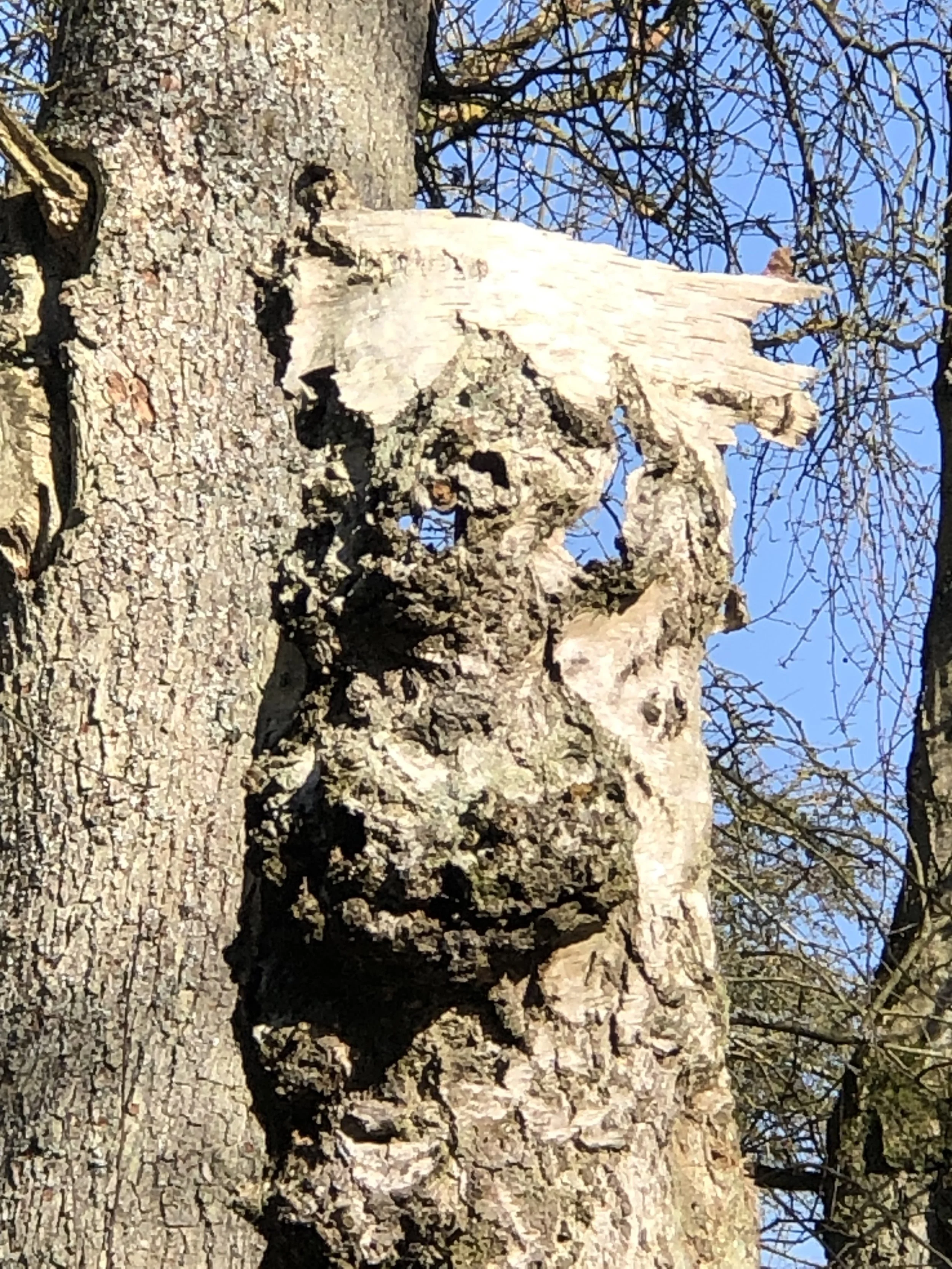 Unfortunately a sudden cold spell did for the frogspawn in the Roadside pond. Clare spotted another unfamiliar pareidolic creature in the Pit Wood.