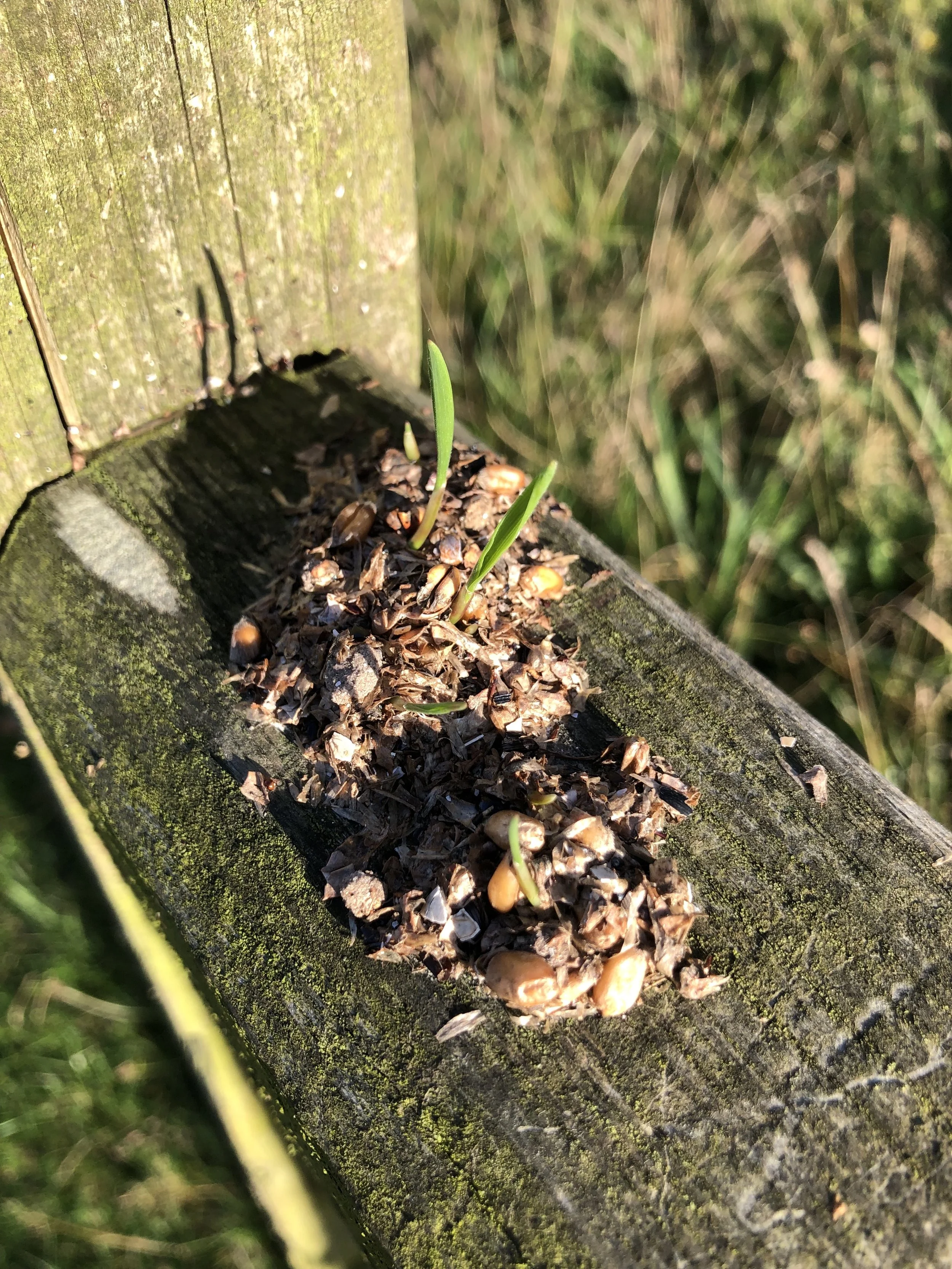 Clare was amused to notice another pellet, probably from a pigeon’s crop, on the new gate on the Hayfield. Recent rain had caused the grain to sprout.
