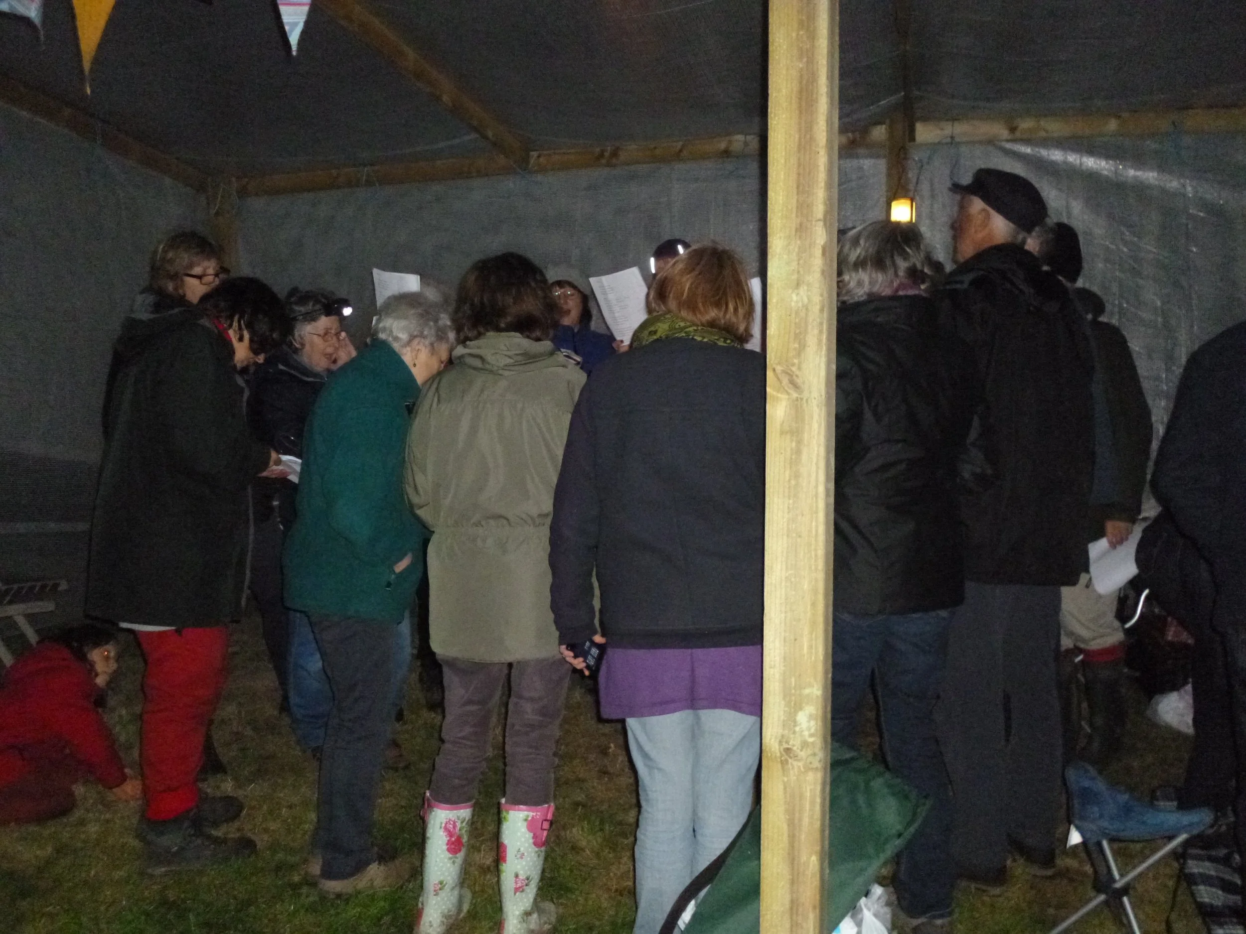 Clare loves building bonfires. We both like marking significant occasions with a party. So, the first opportunity to put these together was a Naming and Land Warming party. Friends helped us to build and decorate a shelter and members of Tynedale Community Choir, to which Clare belongs, put together a repertoire of land and tree related songs. We walked down a specially made path to a site we had chosen to mark the occasion, and planted our first tree - a Bird Cherry that Clare’s daughter Mathilda had given us as a wedding gift in 2009. Back at the shelter, Clare gave a short speech naming the land, and our friend Penny sang a song she had composed especially for us. We were lucky enough to end the evening with a spectacular sunset.