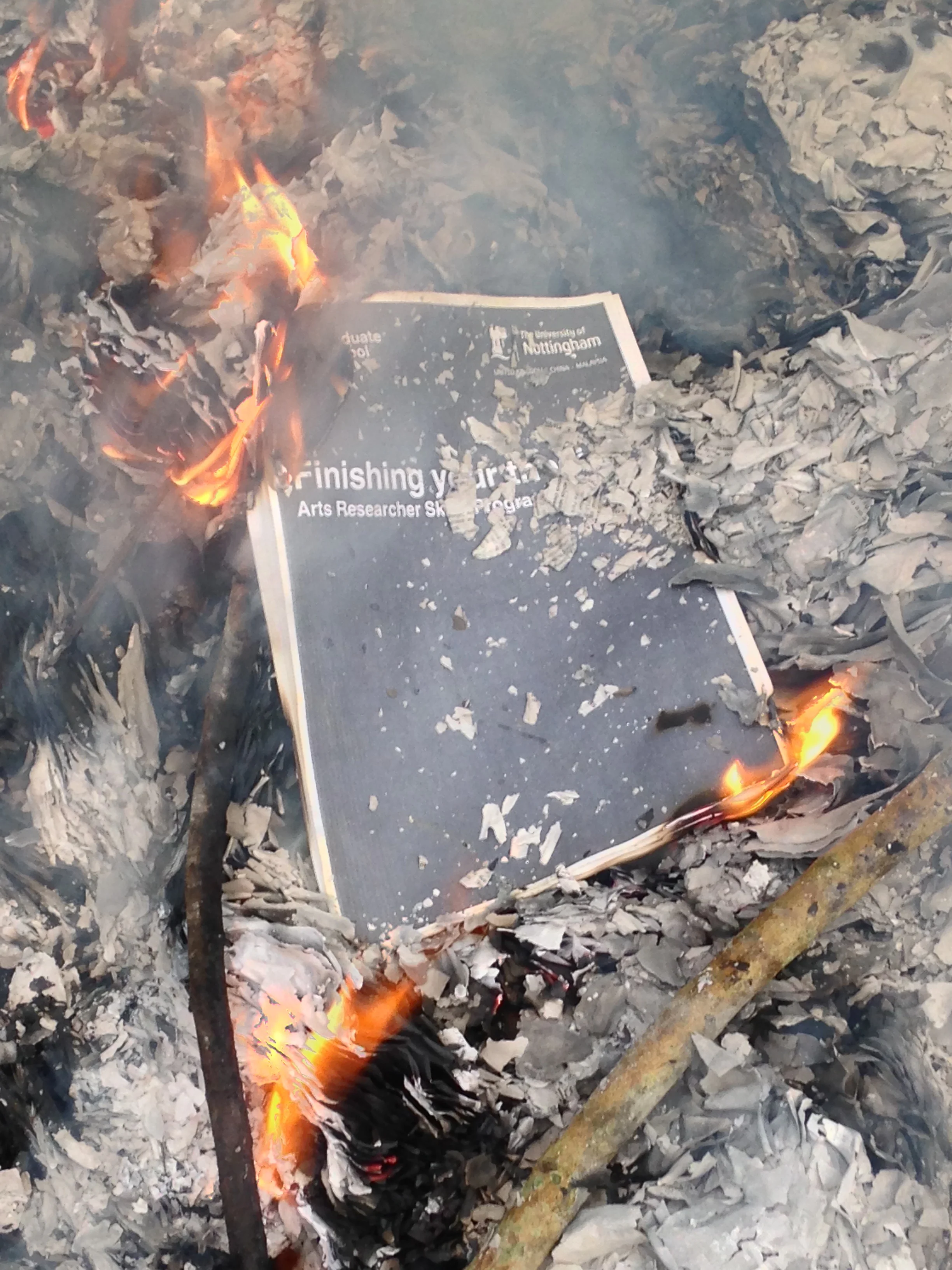 In the throes of her PhD studies, Mathilda conceived the idea of making her own ending to the process by burning her notes once she had finished and been awarded her Doctorate. Happy to have another excuse to build a bonfire, we offered Liddells as the venue for this momentous ritual. The ensuing conflagration was deeply satisfying for all concerned.